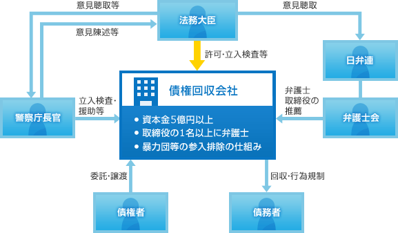 不良債権問題の早期解決のため、1999年2月に「債権管理回収業に関する特別措置法」(サービサー法)が施行され、日本において債権回収会社(サービサー)が誕生しました。日本の弁護士法では、弁護士以外の営利法人は法律事務の取扱いができませんが、この法律により、特定の債権について民間企業による法律事務取扱い(債権回収業務)が解禁されました。この法律は、反社会的勢力を排除する点から、各種の行為規制および資本金、役員の制限が規定されています。なお、当社アルファ債権回収株式会社は、2006年3月27日に許可番号第101号として、法務大臣から債権管理回収業の営業許可を受けております。